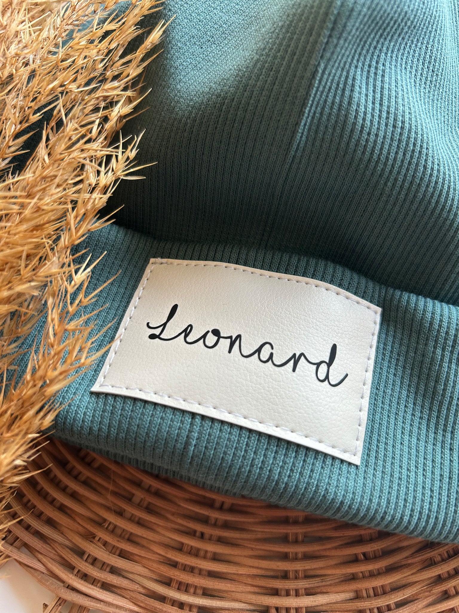 Das Kunstleder-Label mit Namen auf dem Umschlag macht die Mütze zu einem echten Hingucker.